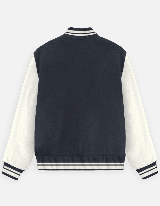 The Navy Blue Varsity Jacket from Unlined is made with 300 GSM premium cotton. Designed for comfort, structure, and versatility, this plain navy is a timeless minimal essential.